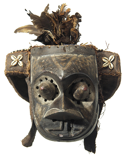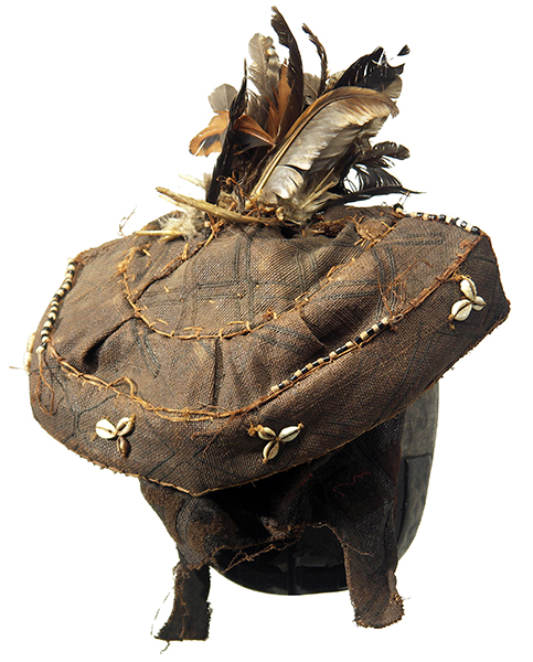 The pwoom itok mask was part of the Kuba royal circle of masks. It is a simple dance mask. The eyes are surrounded by small holes and the mask is attached to an elaborate headdress consisting of feathers and raffia cloth. The dancer who wears the mask plays a wise, tired old man whom the other dancers come to consult.
