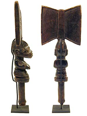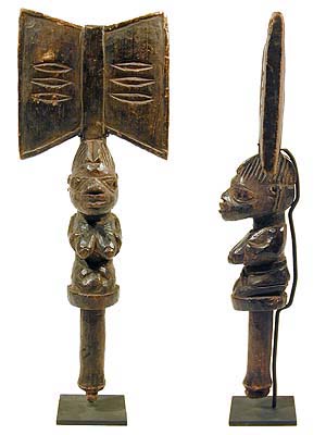 In special festivals and processions, followers of Shango, the Yoruba god of thunder, carry dance wands, oshe shango, depicting a female devotee with Shango's symbol, the double-headed axe. Shango is thought to control the great powers of nature as one of the orisha, or gods.