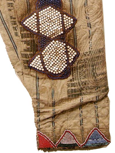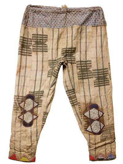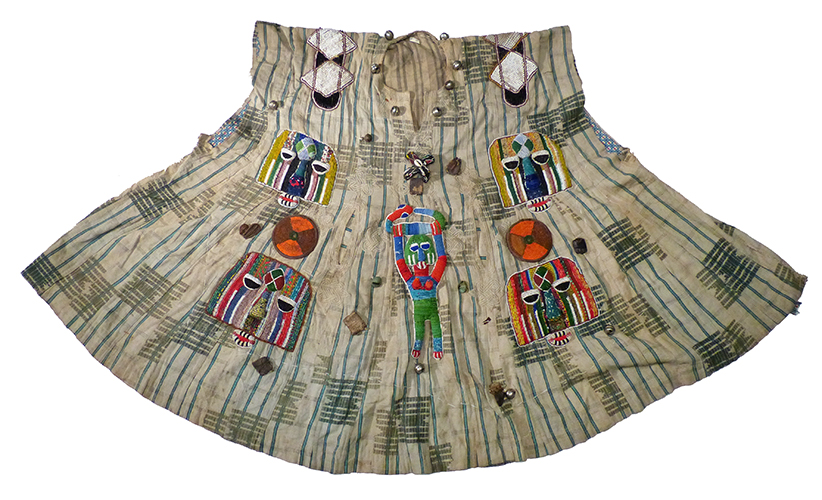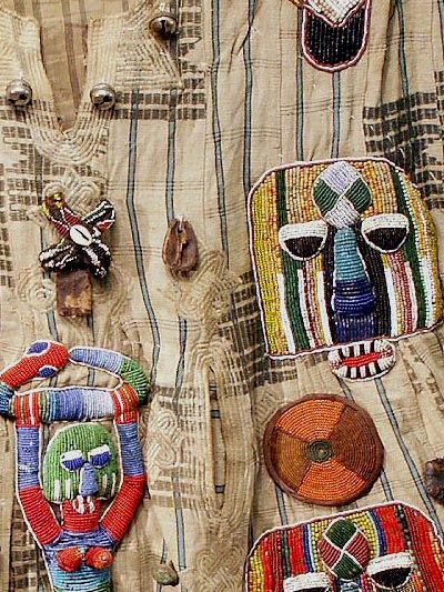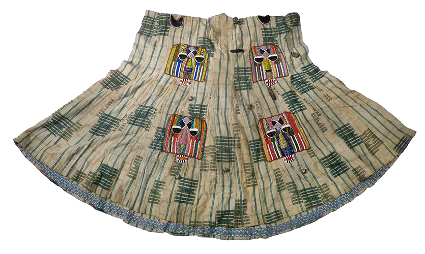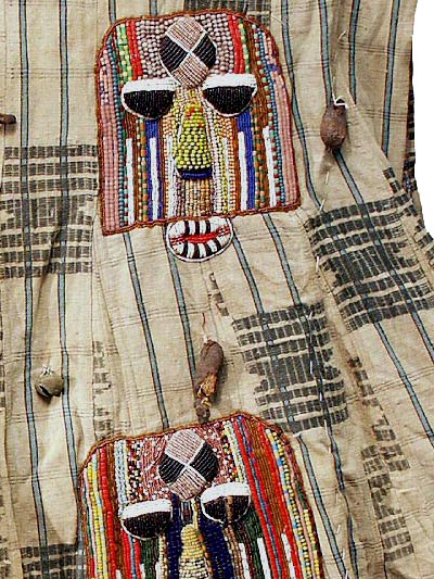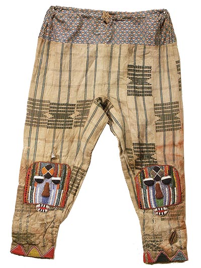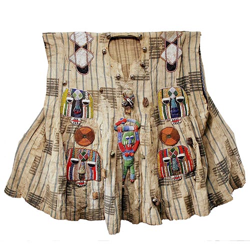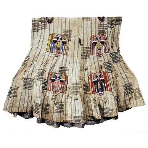 size fits all) held by a drawstring. The embroidery and beadwork is on Yoruba Ashoke strip woven
